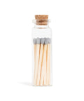 20 matches with natural wood and grey tips in small corked vial with adhesive match striker on bottom.