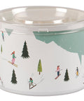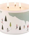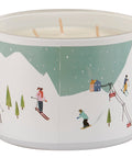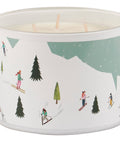 A candle from our Winter Collection displaying a full wrap-around design of people enjoying skiing in a unique hand illustrated style. Skiing candle features soy-based wax and 3 fabric wicks with 30 hours of burn time activating a refreshing Pine scent. Our Skiing Fun candle includes a dust cover and plastic lid for protection and enhanced appearance on store displays. A fun skiing-themed gift perfect for a seasonal home accent.